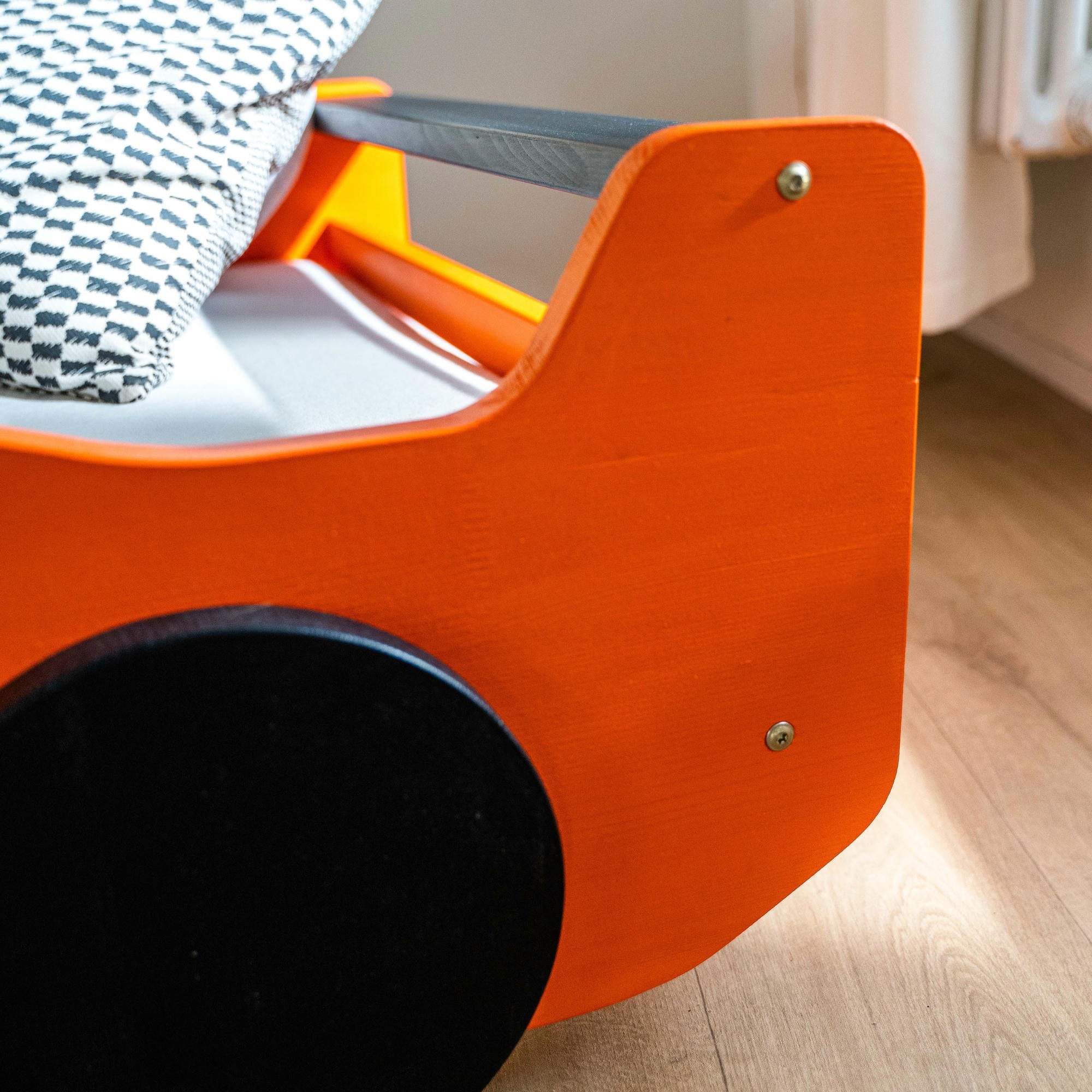 Das Bett ist aus massivem Naturholz gefertigt, was für Stabilität, Langlebigkeit und ökologische Unbedenklichkeit sorgt. Die Oberfläche ist mit einem hypoallergenen, wasserbasierten Lack behandelt, der gesundheitlich unbedenklich und vollkommen geruchsfrei ist. Alle Elemente sind sorgfältig geschliffen, und die Kanten abgerundet, um maximalen Schutz für das Kind zu gewährleisten.