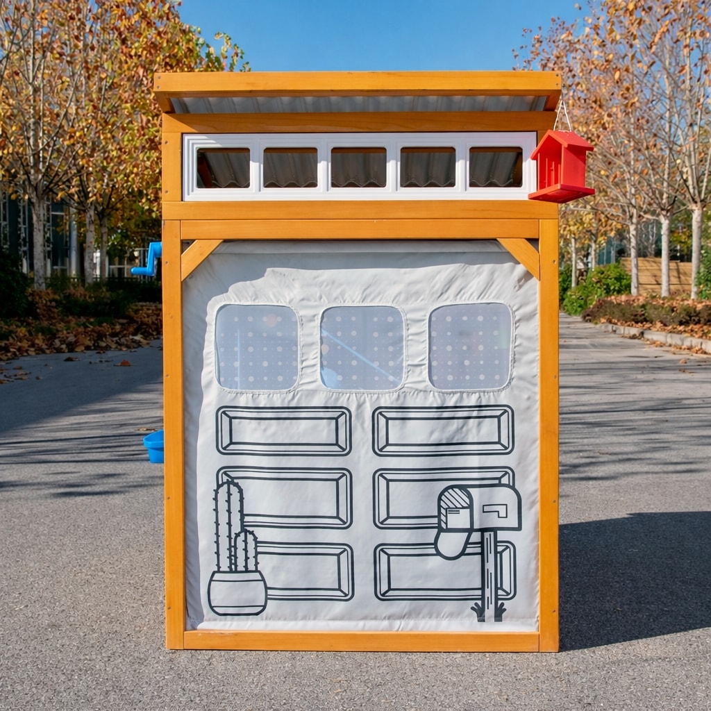 Das Haus ist ausgestattet mit rollbaren „Garagentoren“ mit Kurbel, einer Steckwand und einem erhöhten Tisch mit Arbeitsfläche für handwerkliche Tätigkeiten. Ablagefächer in verschiedenen Größen helfen, Ordnung zu halten, und der Außenbereich kann als Sitzbank oder zusätzliche Arbeitsfläche genutzt werden. Ergänzt wird das Äußere durch ein Vogelhäuschen und Blumenkästen am Fenster, die das Spielen im Kontakt mit der Umgebung fördern. Traditionelle Türen sowie ein kleiner Eingang für Haustiere erweitern die Spielmöglichkeiten für die ganze Familie.