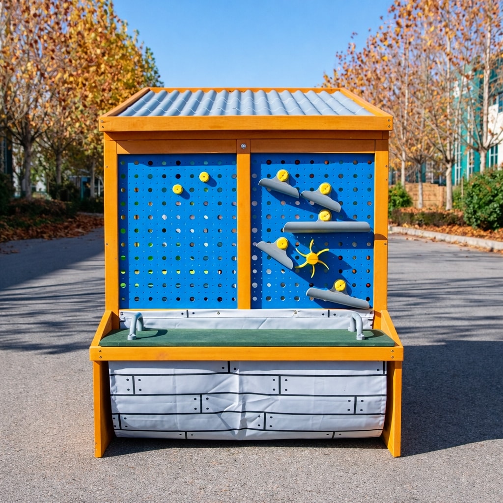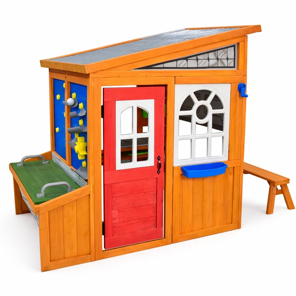 Geben Sie Ihrem Kind Raum zum Entdecken, Gestalten und für konstruktives Spielen! Dieses innovative Holzspielhaus fördert Kreativität, Selbstständigkeit und Fantasie während des täglichen Spiels. Mit seinem schrägen Dach erinnert es an ein kleines Werkzeughäuschen und bietet eine Vielzahl durchdachter Spiel- und Praxiselemente.