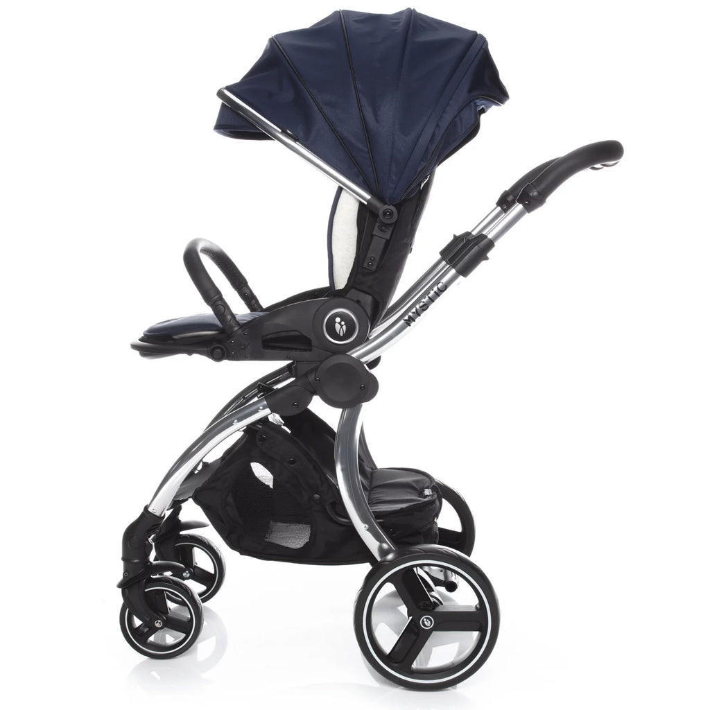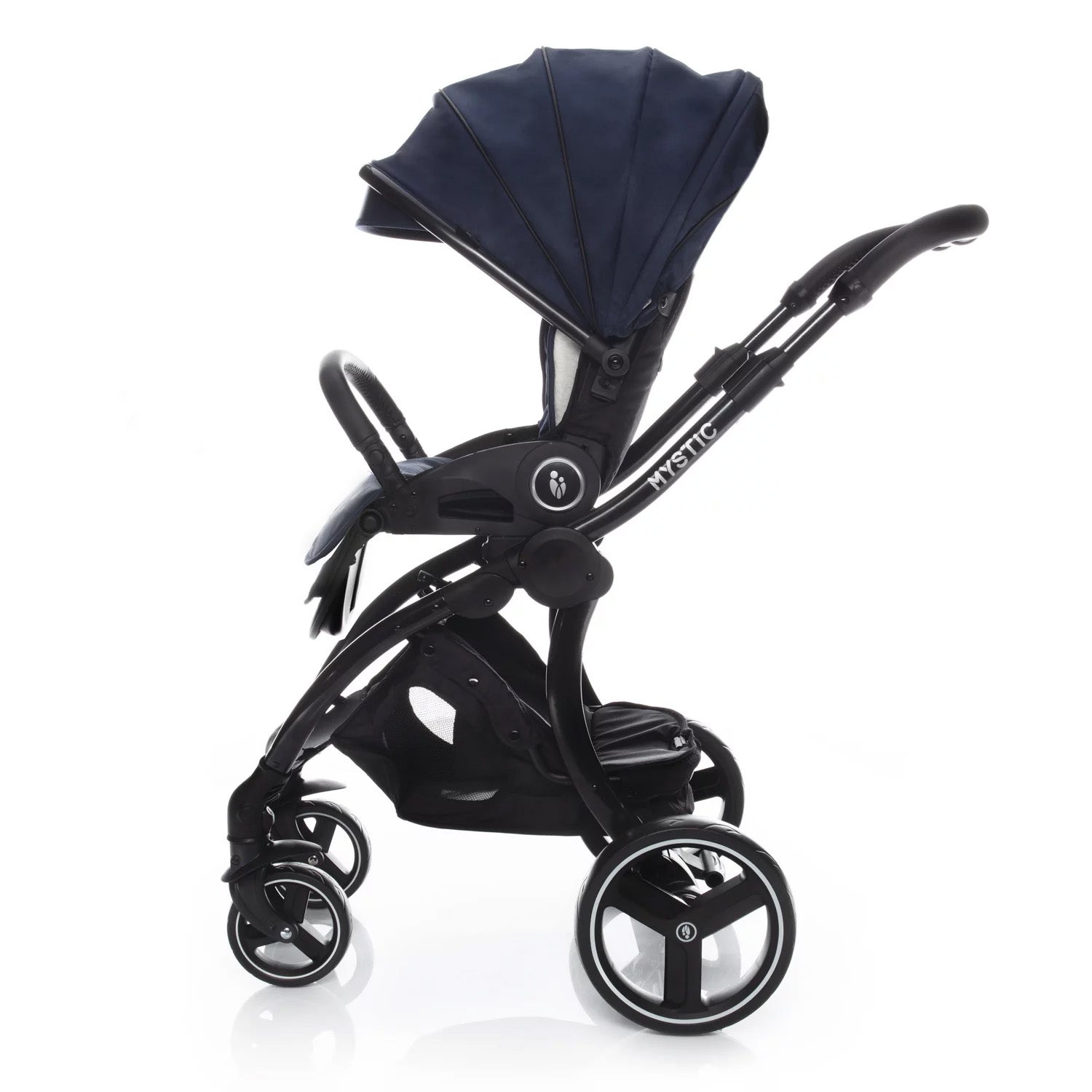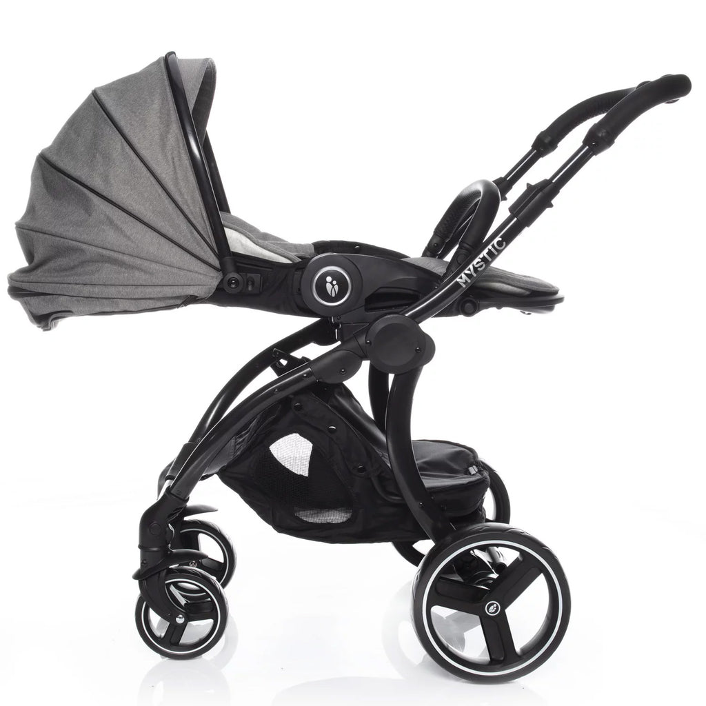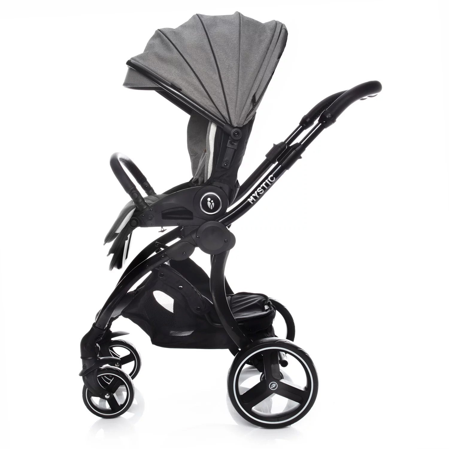 Minimalistisches Design, komfortable Liegewanne mit Fußsack, Verdeck mit Belüftung, robustes Gestell, geräumiger Korb, höhenverstellbarer Schieber, gefederte Räder und verstellbarer Sportsitz – das ist der Kinderwagen Mystic. Geeignet für Kinder von Geburt bis 15 kg.