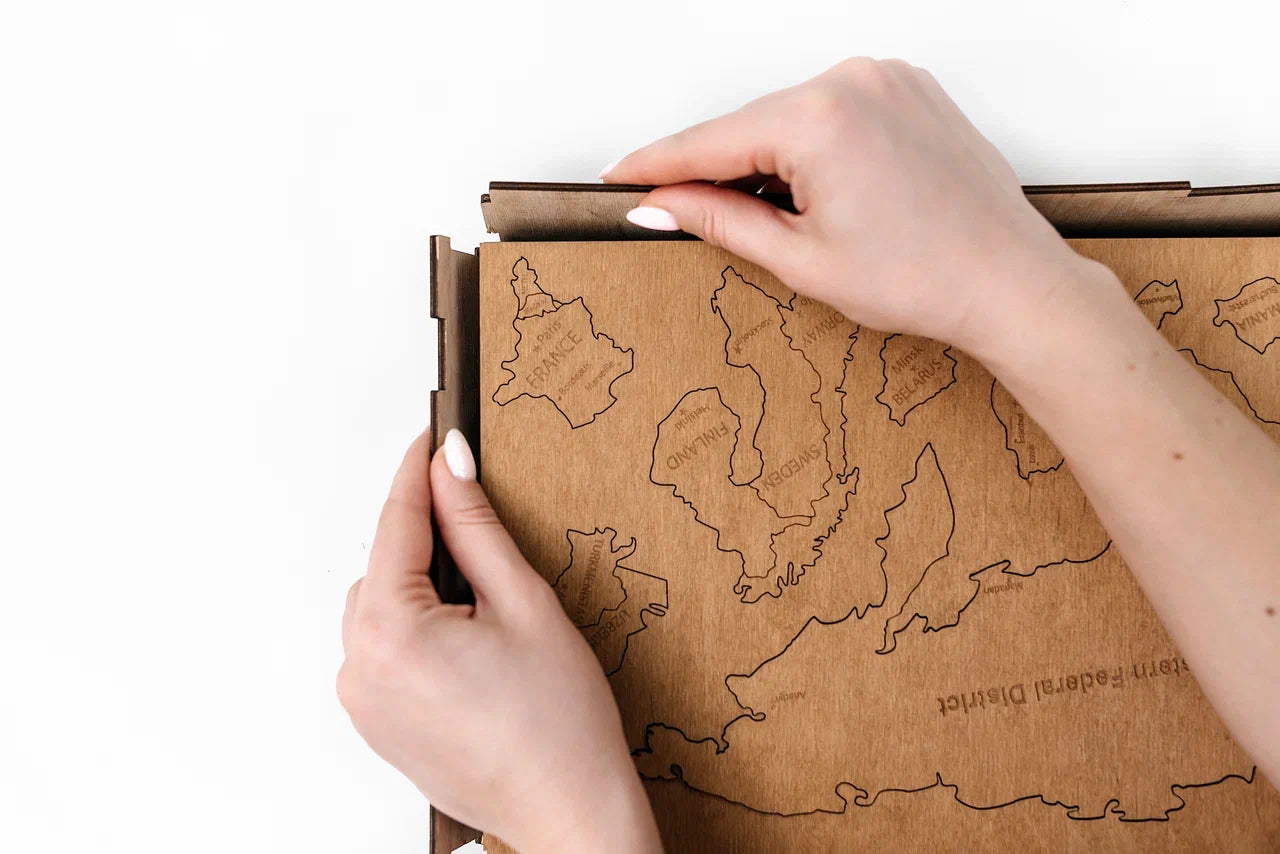 Die Karte hilft Kindern, Geografie zu entdecken, ihren Horizont und ihre Fantasie zu erweitern sowie spielerisch Kontinente, Länder und Ozeane kennenzulernen. Die dreidimensionalen Holzelemente verleihen dem Produkt Tiefe und machen es besonders attraktiv für Kinder.