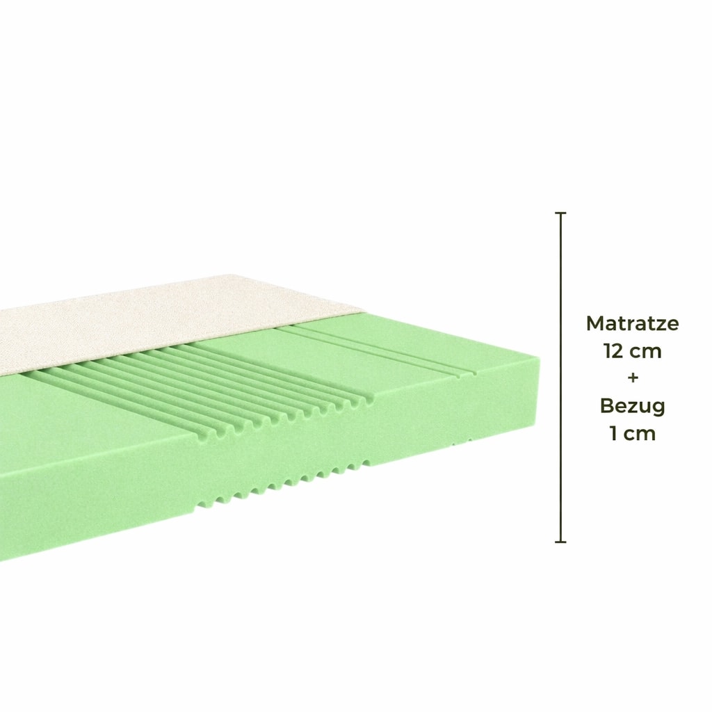 Der abnehmbare, hypoallergene Bezug lässt sich leicht in zwei Teile trennen und ist mit einem Reißverschluss ausgestattet, sodass er bequem abgenommen, bei 60 °C gewaschen und wieder aufgezogen werden kann. Das ist eine praktische Lösung, um die Matratze sauber zu halten und auf alle nächtlichen Missgeschicke vorbereitet zu sein.