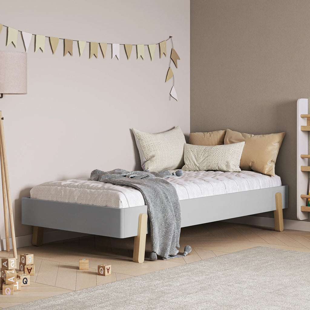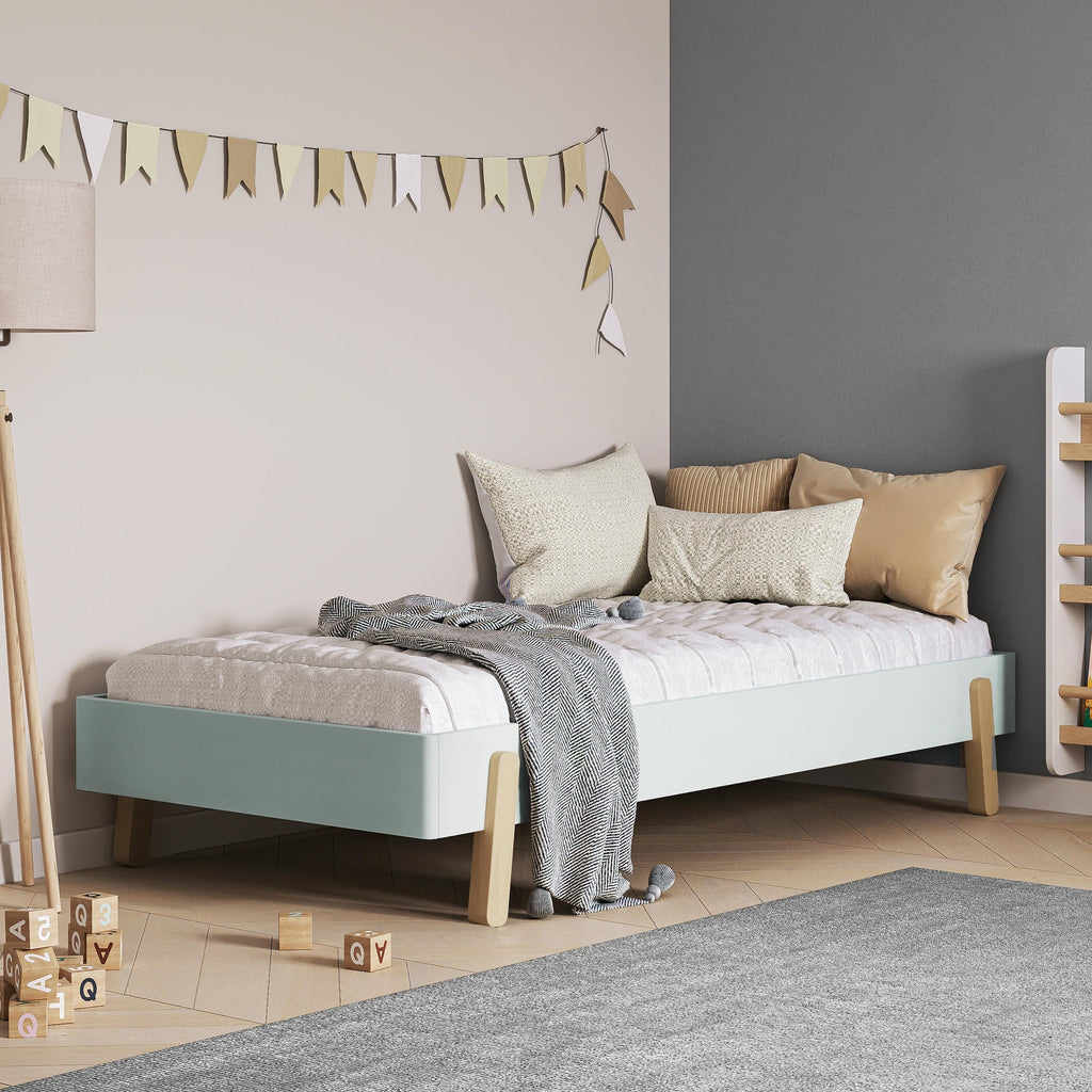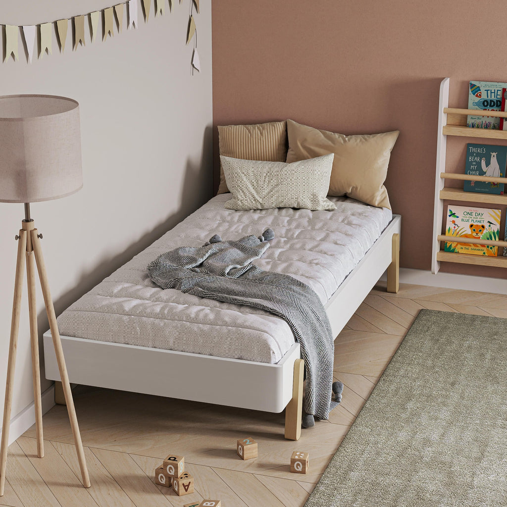 Es ist aus massivem Fichtenholz mit einer umweltfreundlichen Beschichtung gefertigt und vereint minimalistisches Design mit hoher Stabilität. Zum Lieferumfang gehört ein seitlicher Rausfallschutz, der zusätzliche Sicherheit bietet – ideal für Kinder, die vom Gitterbett in ein größeres Bett wechseln. Die Konstruktion ist bis zu 120 kg belastbar, sodass Eltern bequem neben ihrem Kind sitzen können, etwa beim Vorlesen. Empfohlen für Kinder ab 3 Jahren. Erhältlich in verschiedenen Farbvarianten und mit wahlweise geraden oder schrägen Beinen. Die einfache Montage wird durch eine detaillierte Schritt-für-Schritt-Anleitung erleichtert.