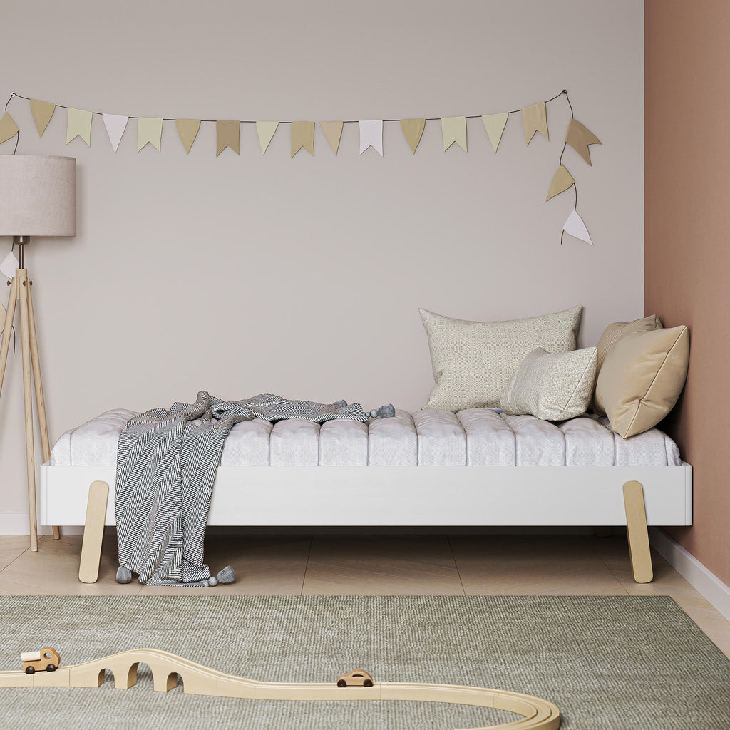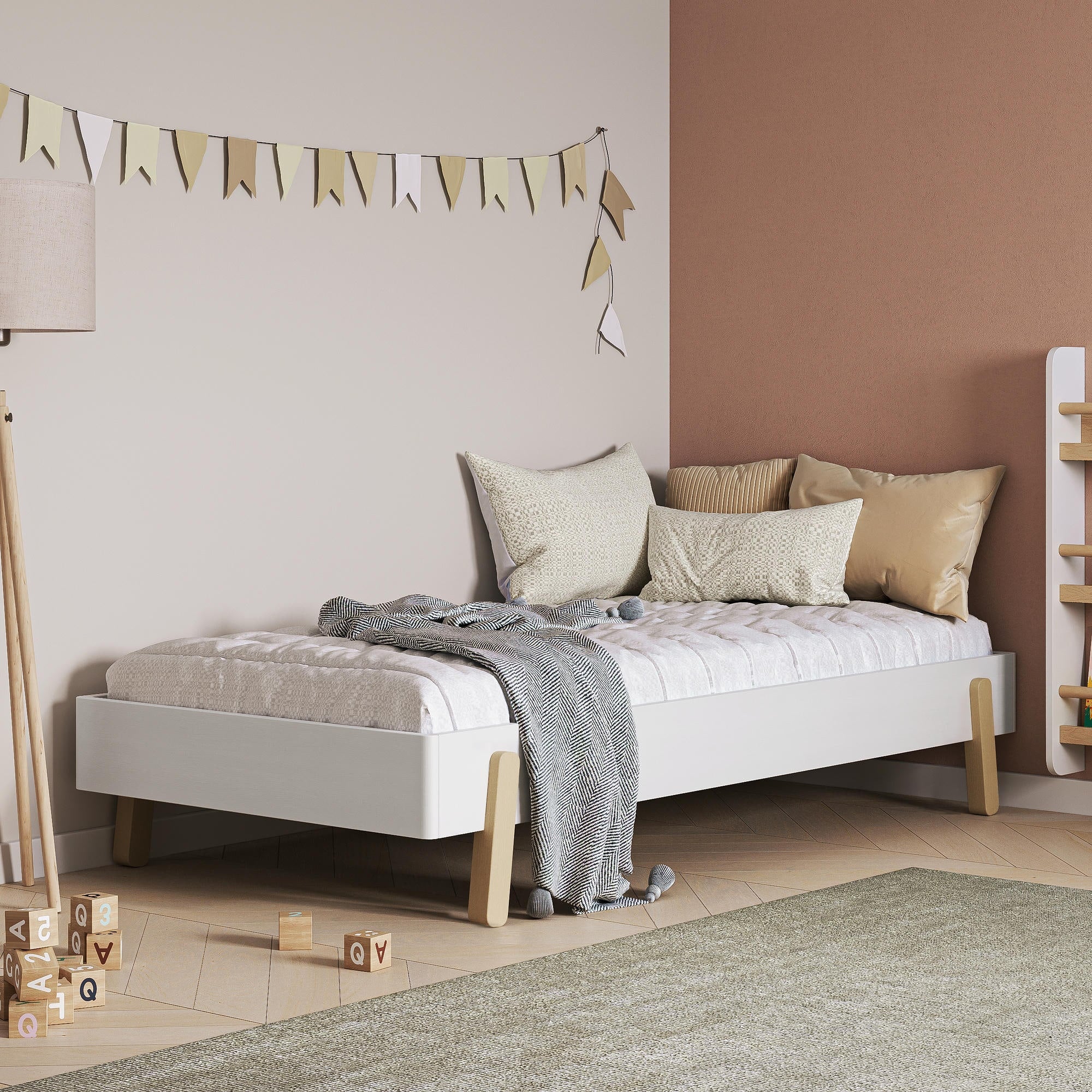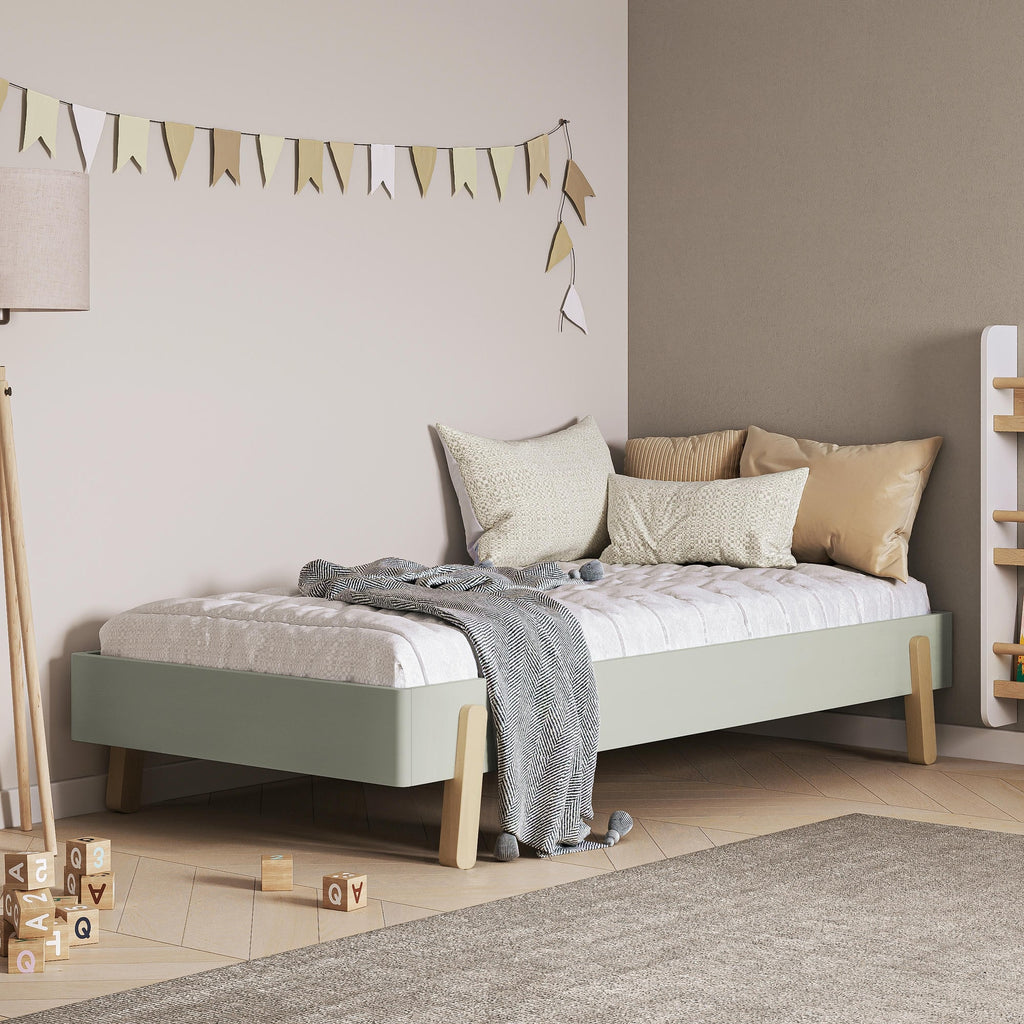 Es ist aus massivem Fichtenholz mit einer umweltfreundlichen Beschichtung gefertigt und vereint minimalistisches Design mit hoher Stabilität. Zum Lieferumfang gehört ein seitlicher Rausfallschutz, der zusätzliche Sicherheit bietet – ideal für Kinder, die vom Gitterbett in ein größeres Bett wechseln. Die Konstruktion ist bis zu 120 kg belastbar, sodass Eltern bequem neben ihrem Kind sitzen können, etwa beim Vorlesen. Empfohlen für Kinder ab 3 Jahren. Erhältlich in verschiedenen Farbvarianten und mit wahlweise geraden oder schrägen Beinen. Die einfache Montage wird durch eine detaillierte Schritt-für-Schritt-Anleitung erleichtert.