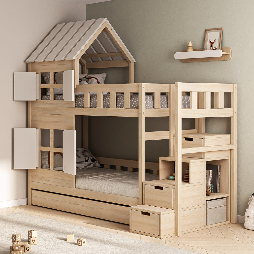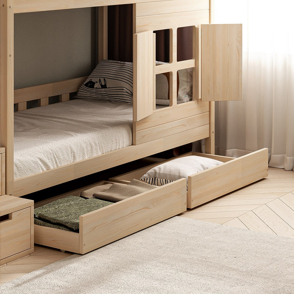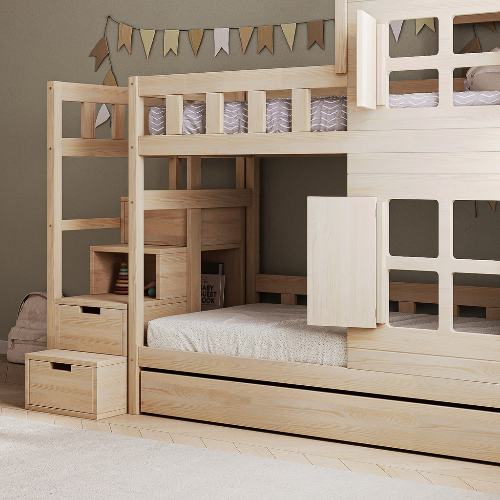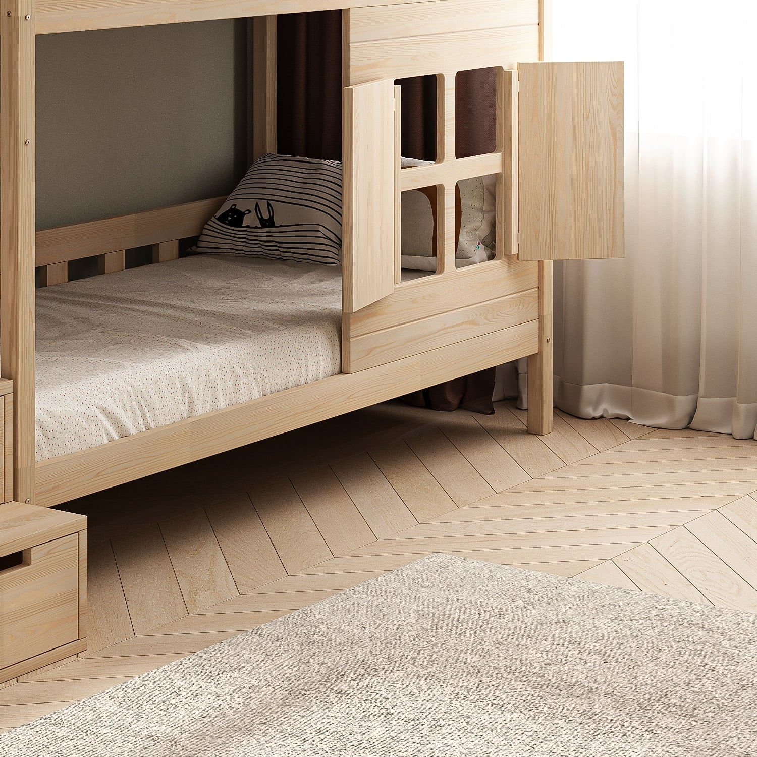 Schaffen Sie ein zauberhaftes Kinderzimmer für zwei – das BusyKids DREAM-HOUSE Bett vereint Funktionalität, Stil und Komfort. Der Rahmen besteht aus hochwertigem Massivholz mit einer umweltfreundlichen Beschichtung und ist so verarbeitet, dass er für Kinder absolut sicher ist. Das obere Bett verfügt über einen zuverlässigen Fallschutz, während die seitliche Treppe den Kindern ein leichtes und sicheres Hinaufsteigen ermöglicht. Unter der oberen Liegefläche befinden sich geräumige Schubladen, die helfen, Ordnung zu halten und den Platz optimal zu nutzen.