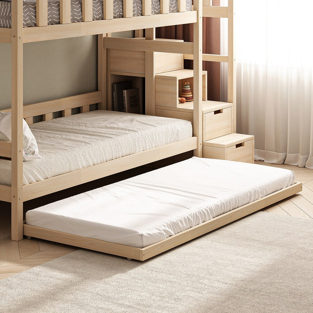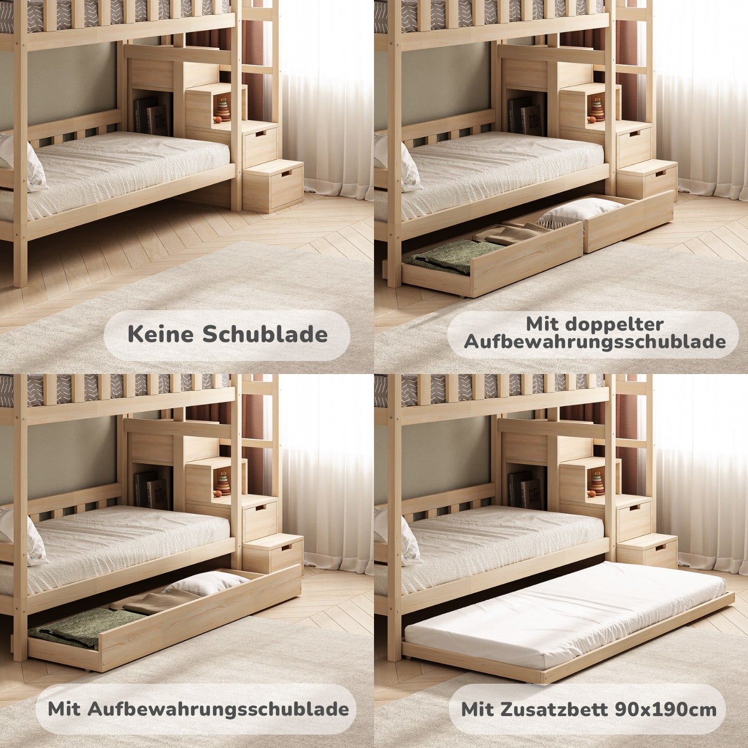 Jede Liegefläche ist bis zu 120 kg belastbar, sodass Eltern sich problemlos neben ihr Kind setzen können. Das Bett ist für Kinder ab 3 Jahren empfohlen. Alle Oberflächen sind glatt geschliffen, die Kanten abgerundet, und die Beschichtung ist vollkommen unbedenklich für die Gesundheit der Kinder. Das Bett wird zerlegt geliefert und enthält eine ausführliche Anleitung für den schnellen und einfachen Aufbau.