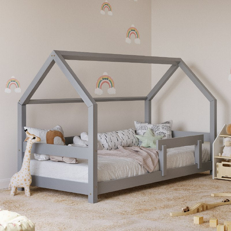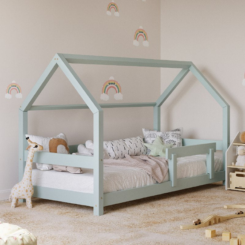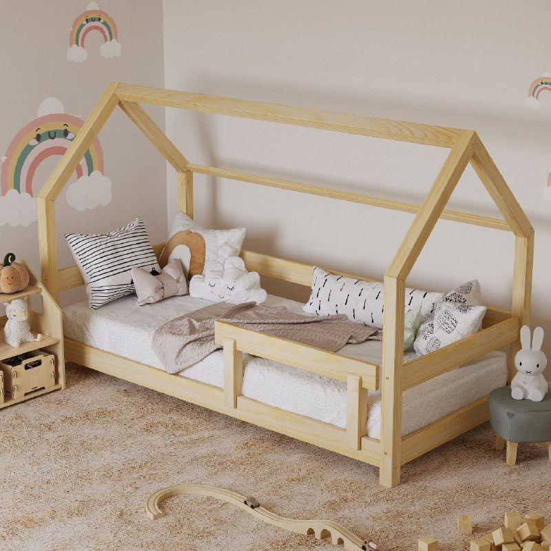 Das Bett ist in Form eines Hauses gestaltet, wodurch es nicht nur zu einem bequemen Schlafplatz wird, sondern auch zu einer Spielzone, die die Fantasie Ihres Kindes anregt. Der feste seitliche Rand schützt während des Schlafs und sorgt für zusätzliche Sicherheit, besonders für kleine Kinder.