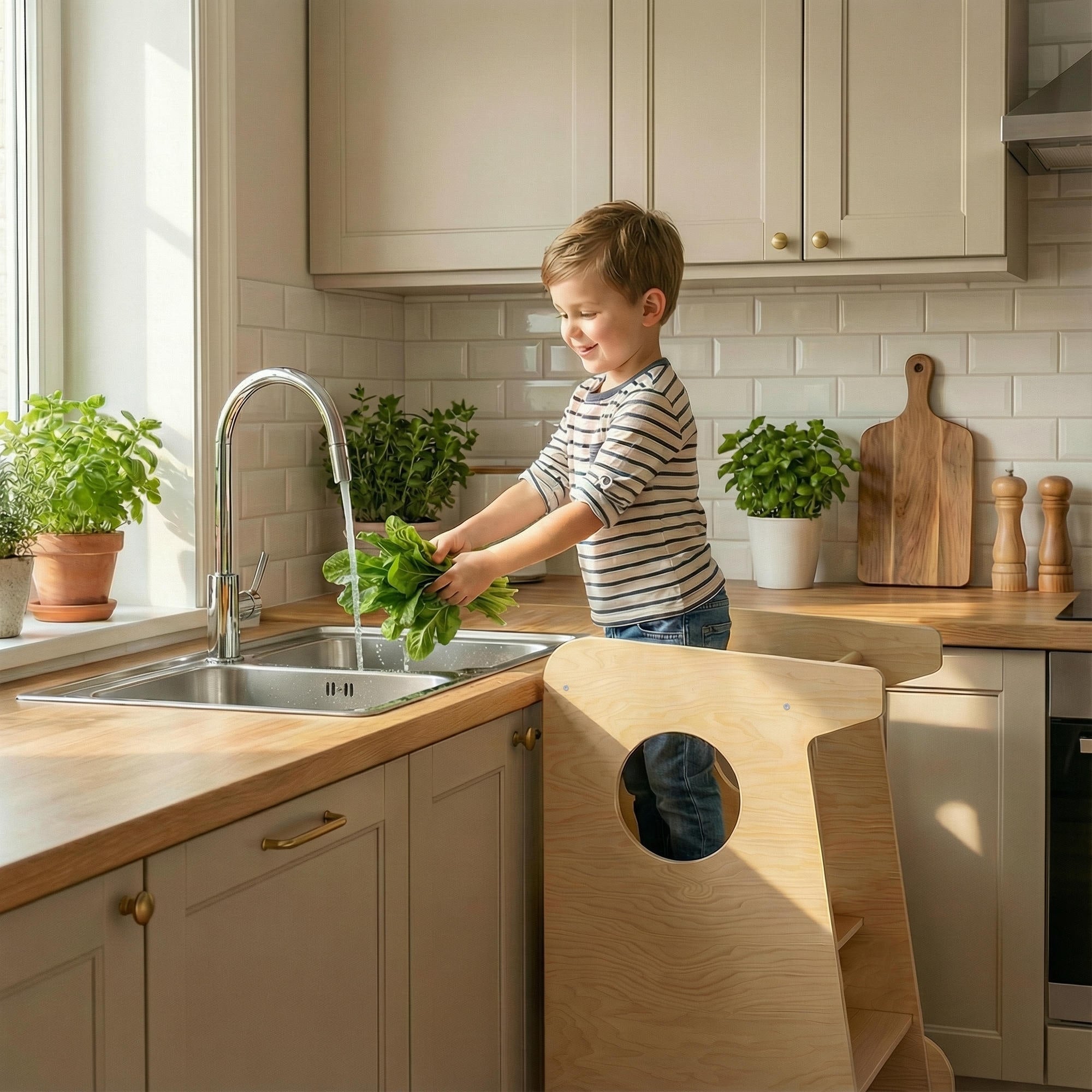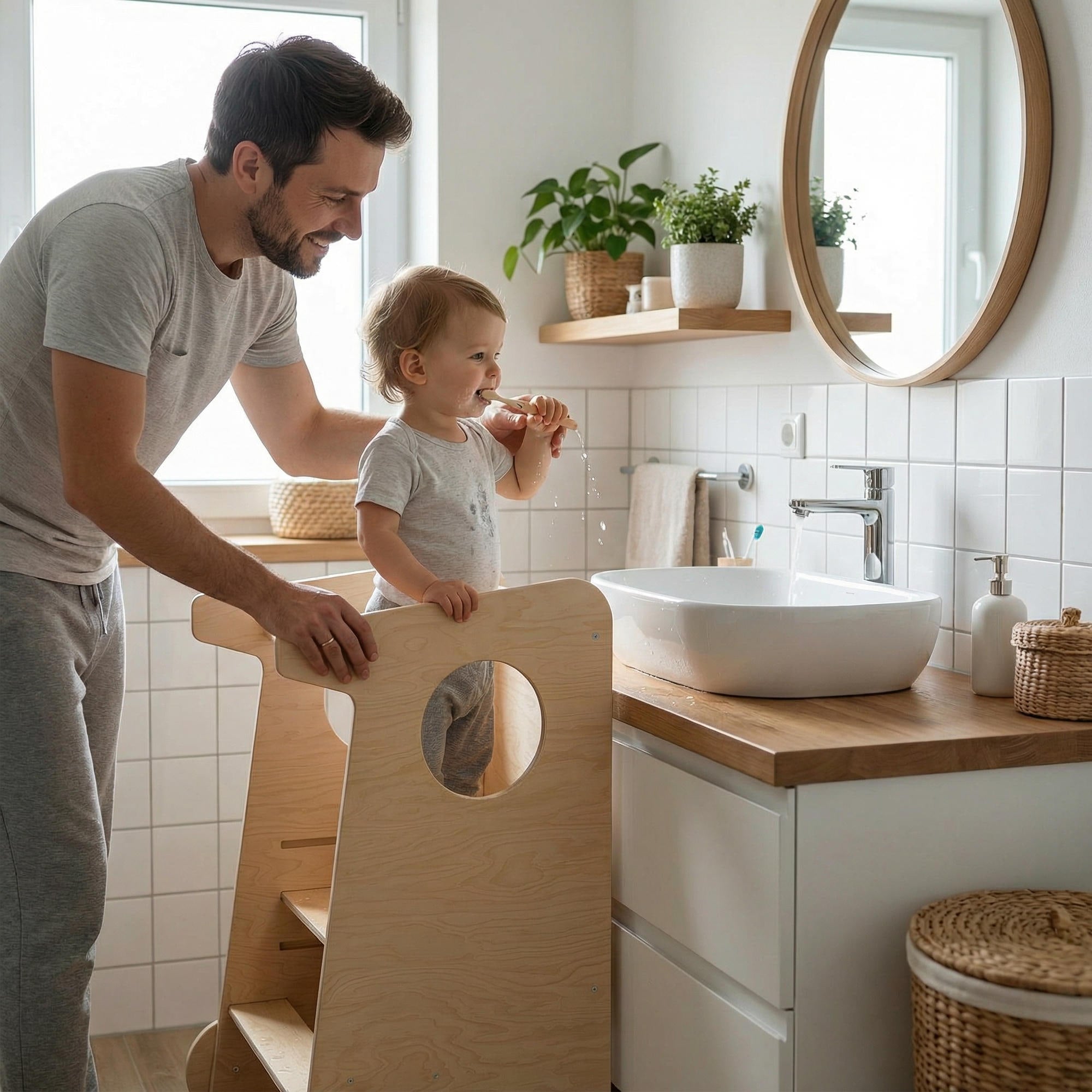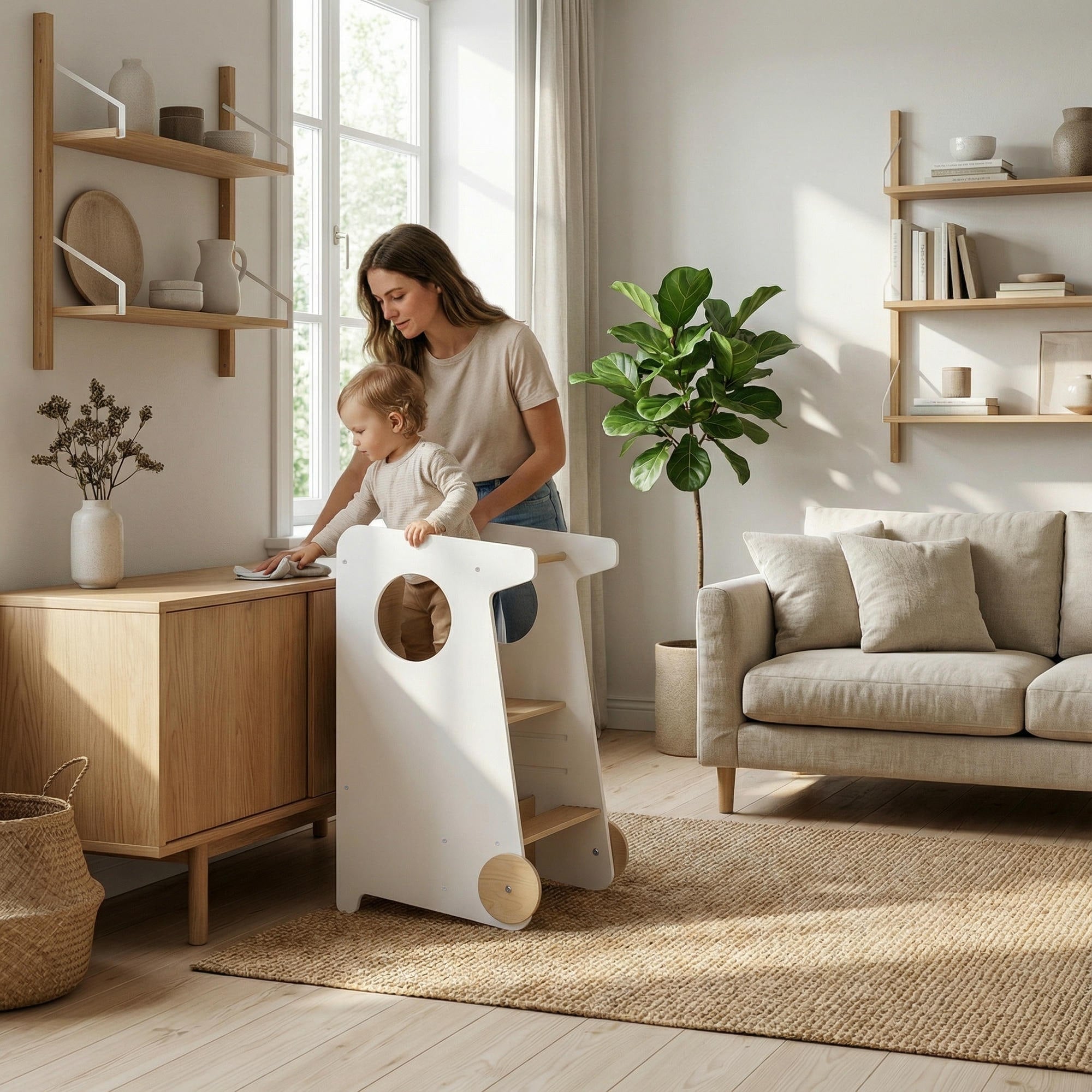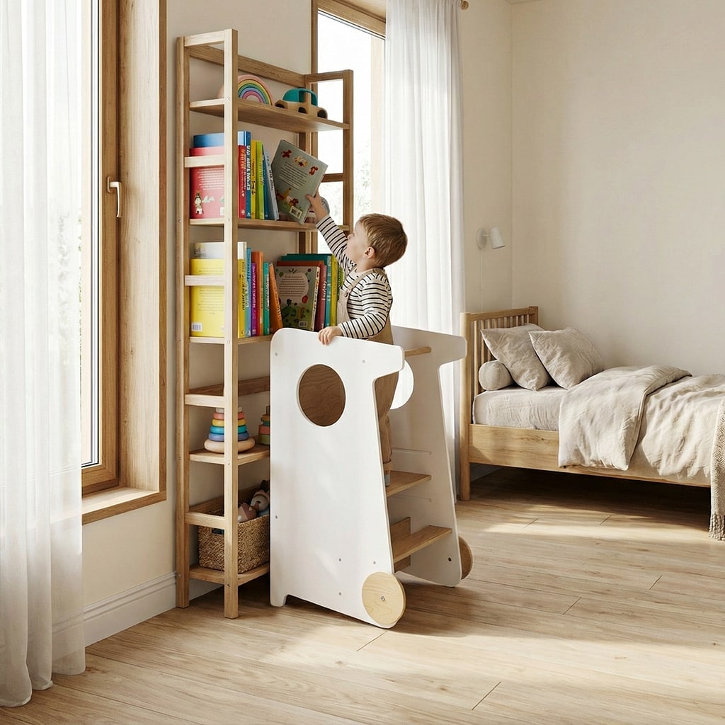 Er hilft dem Kind, sicher die Höhe der Erwachsenen zu erreichen und an alltäglichen Tätigkeiten teilzunehmen – sei es beim Basteln, Spielen, bei der Körperpflege oder beim Helfen der Erwachsenen in der Küche und im Haushalt.