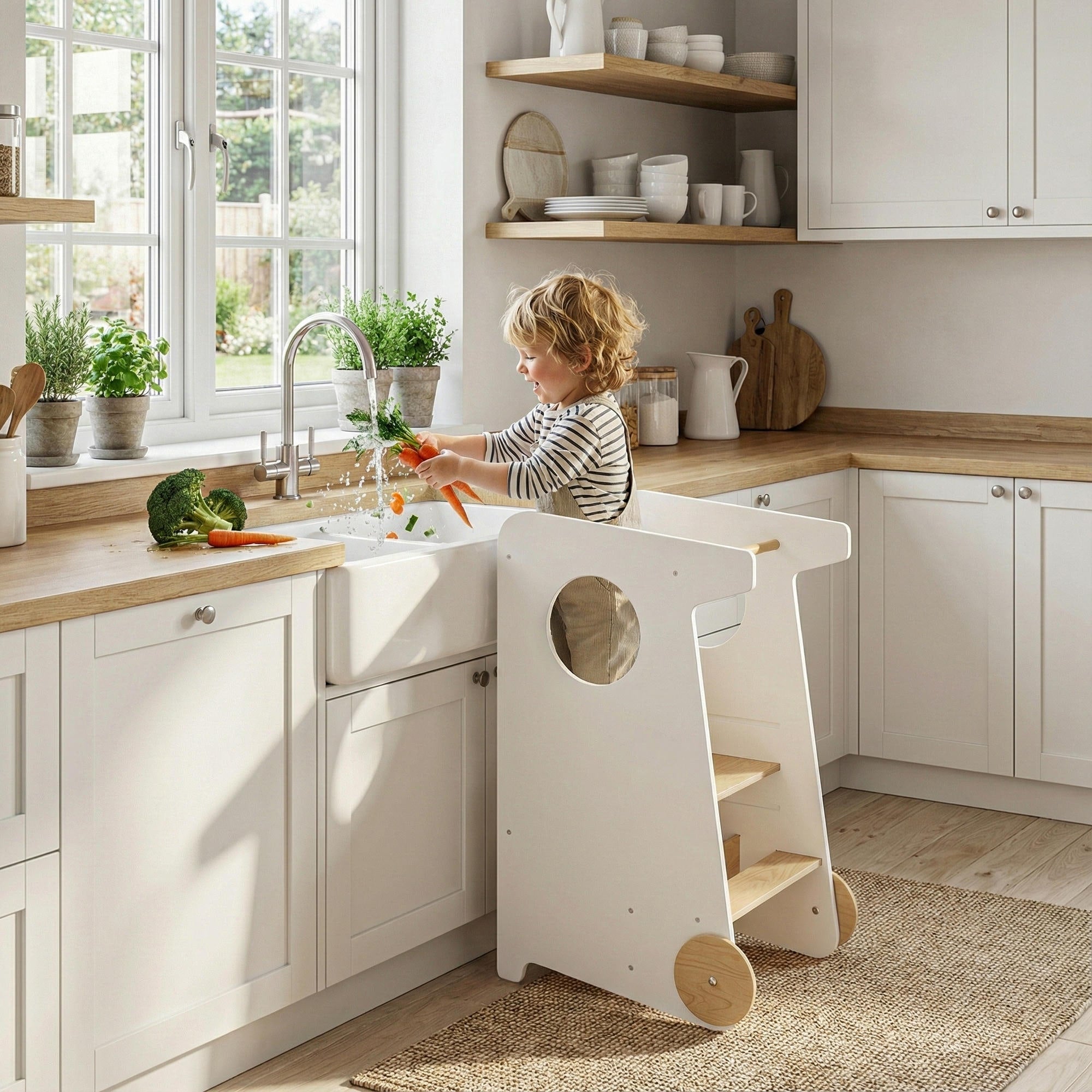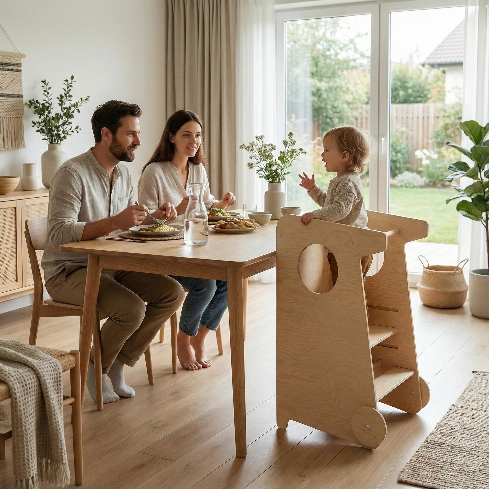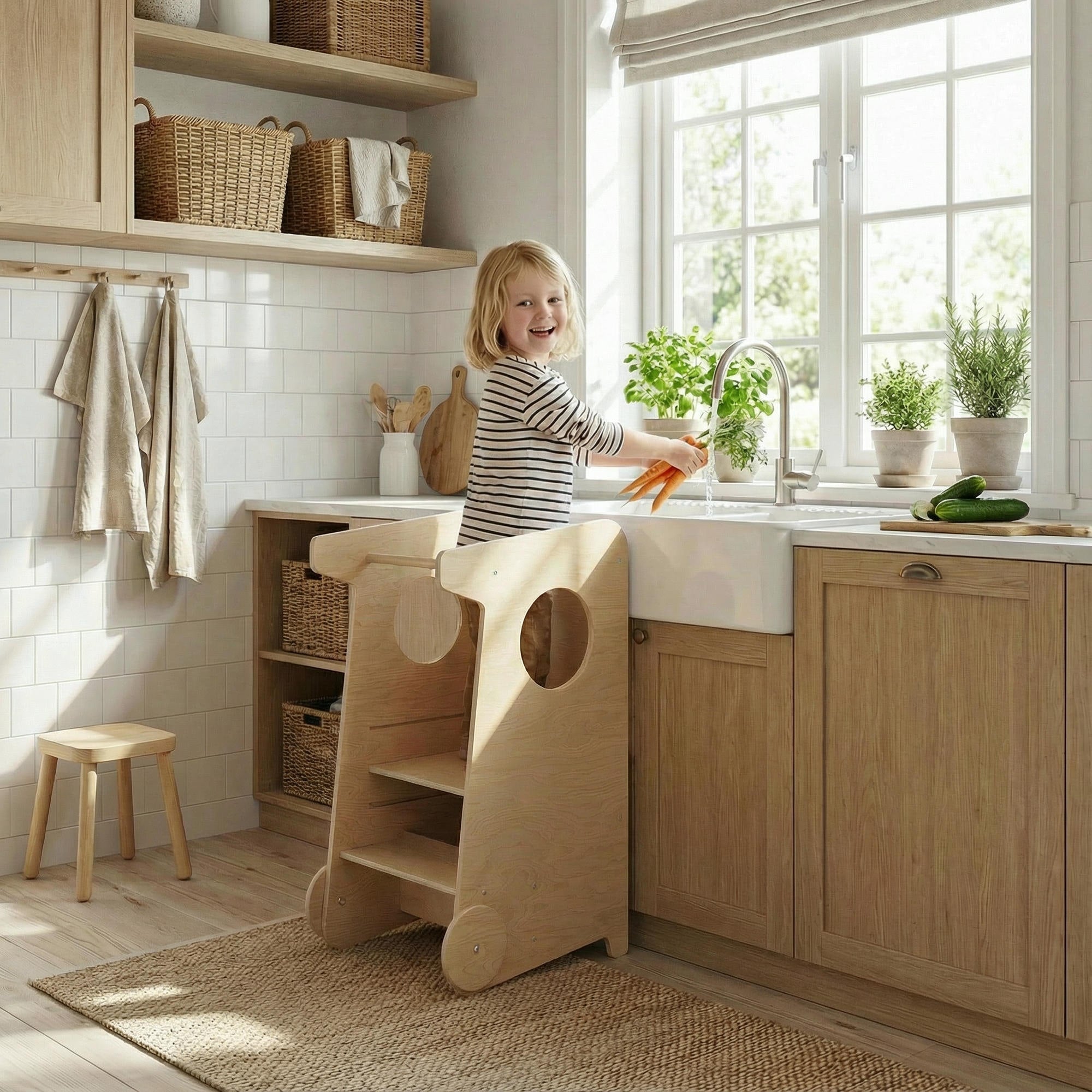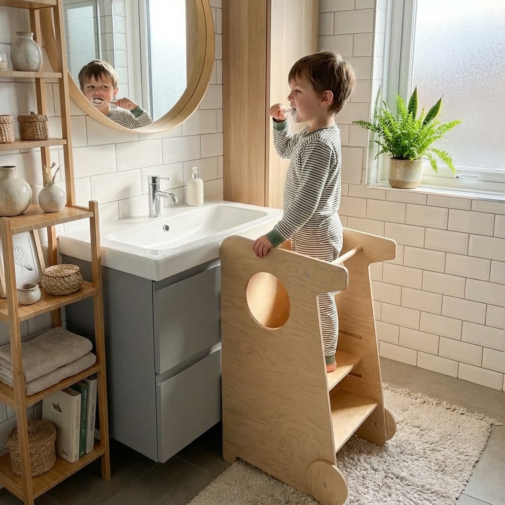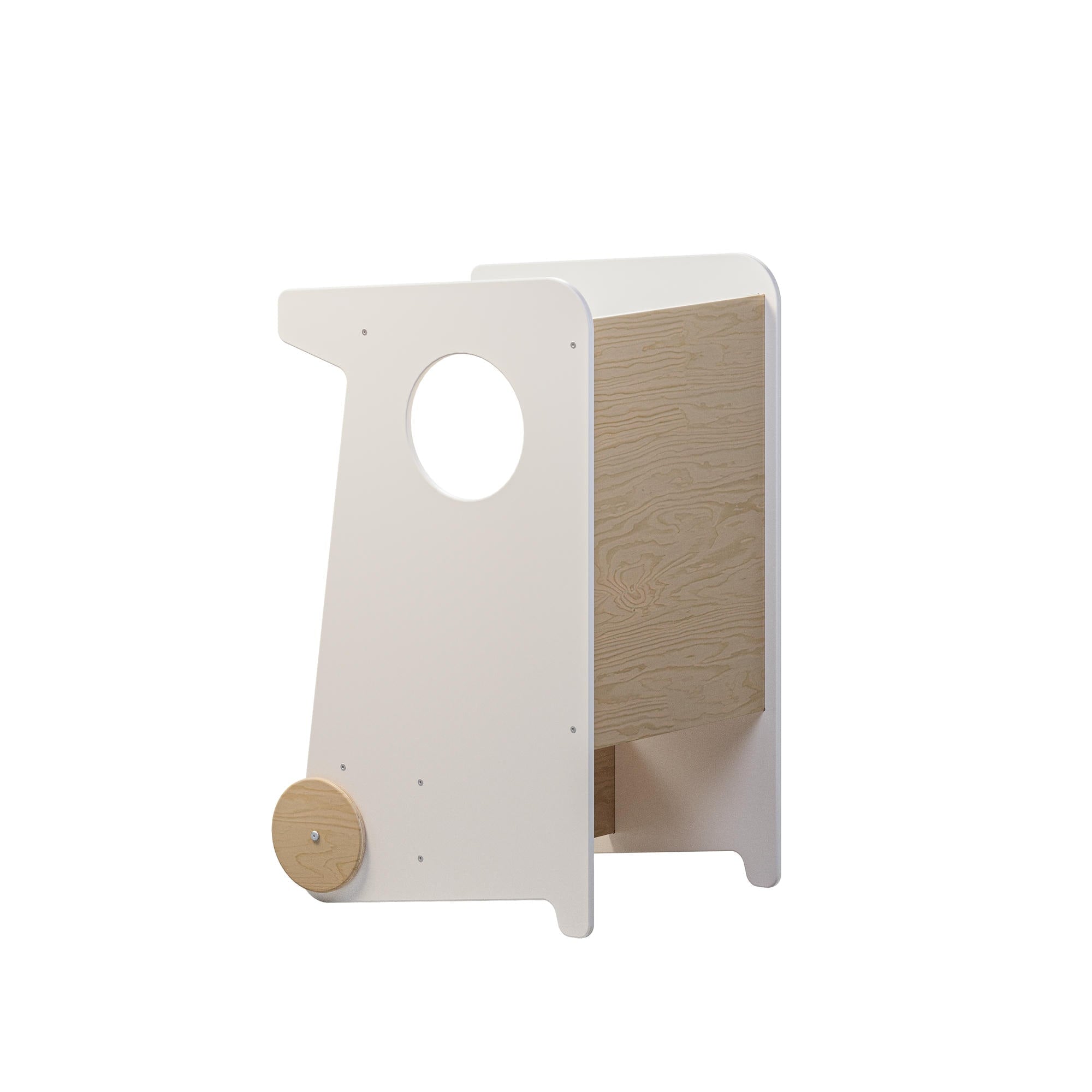 Er hilft dem Kind, sicher die Höhe der Erwachsenen zu erreichen und an alltäglichen Tätigkeiten teilzunehmen – sei es beim Basteln, Spielen, bei der Körperpflege oder beim Helfen der Erwachsenen in der Küche und im Haushalt.