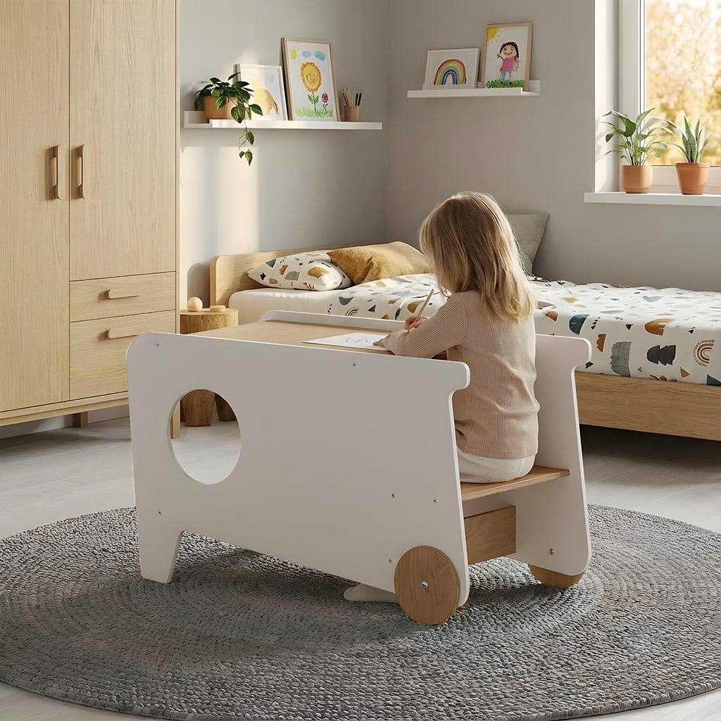 Die durchdachte Konstruktion des BusyKids Tower LUMO bietet maximalen Komfort und eine besonders einfache Handhabung. Der Turm lässt sich im Handumdrehen in einen Tisch, einen Stuhl oder eine funktionale Standfläche verwandeln. Dank der integrierten Rollen kann das Kind ihn selbstständig im Raum bewegen, was Lernen und Spielen noch spannender macht.