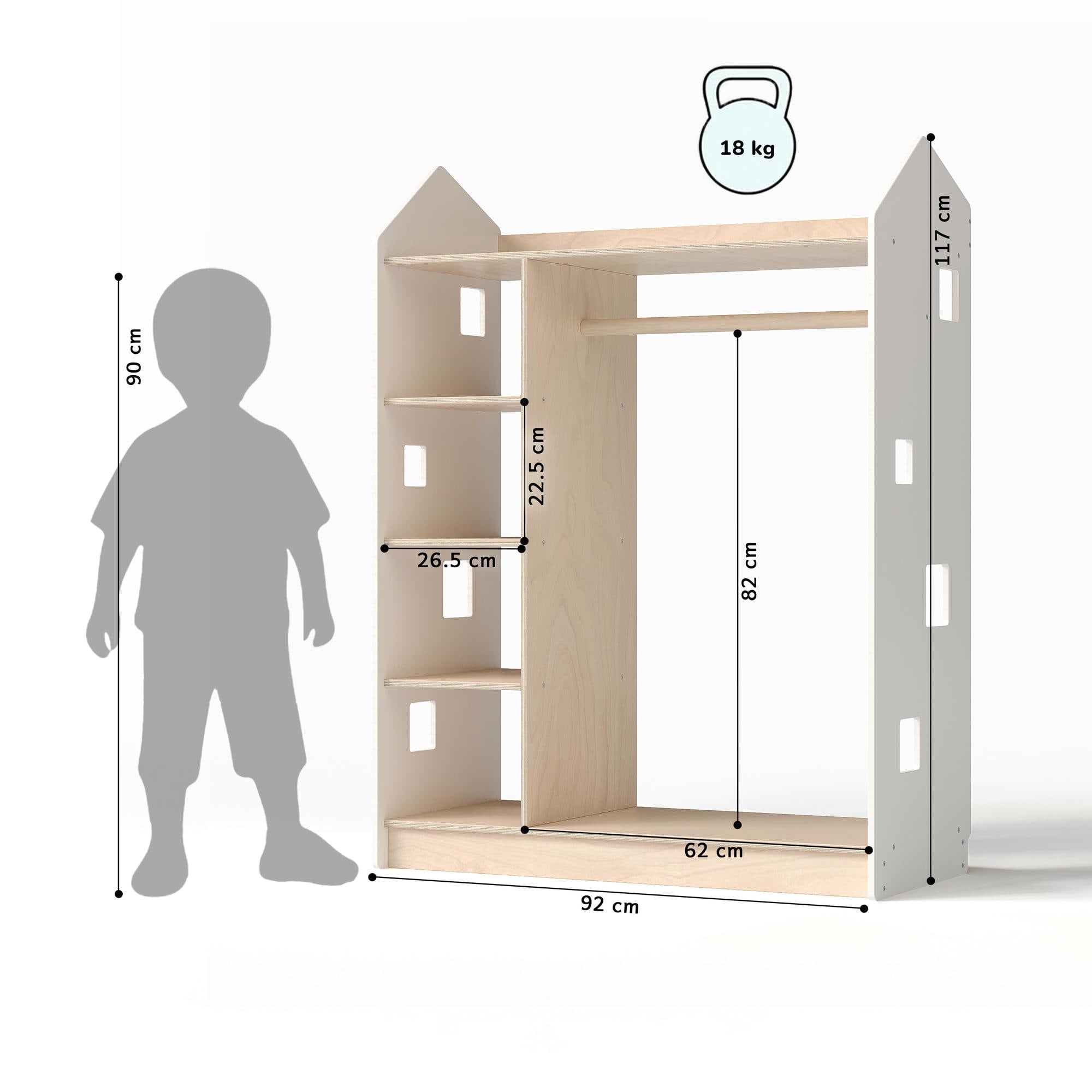 Wir präsentieren Ihnen eine funktionelle Lösung zur effizienten Aufbewahrung und Organisation von Kleidung - ein einzigartiger offener Kinderkleiderschrank in Form eines Hauses, der eine perfekte Ergänzung zu unseren bereits meistverkauften Produkten darstellt: Regale zur Aufbewahrung von Spielzeug und Büchern im Kinderzimmer aus derselben Kollektion.