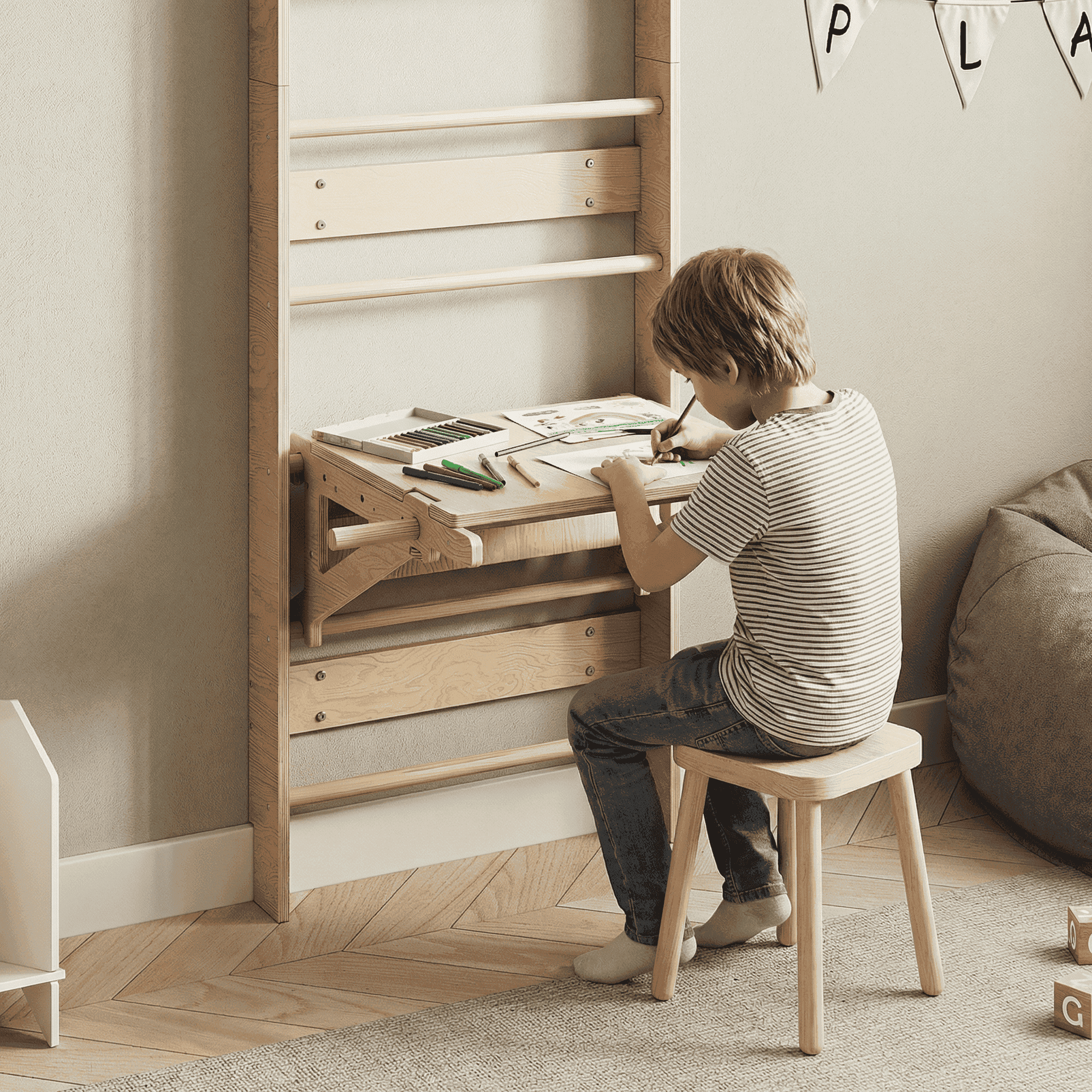 Mit dem EVERGYM TABLE Aufsatz verwandeln Sie Ihre Sprossenwand im Handumdrehen in einen vollwertigen Arbeitsplatz. Perfekt für Hausaufgaben, Basteln oder Malen, ohne wertvollen Platz im Kinderzimmer zu verschwenden.