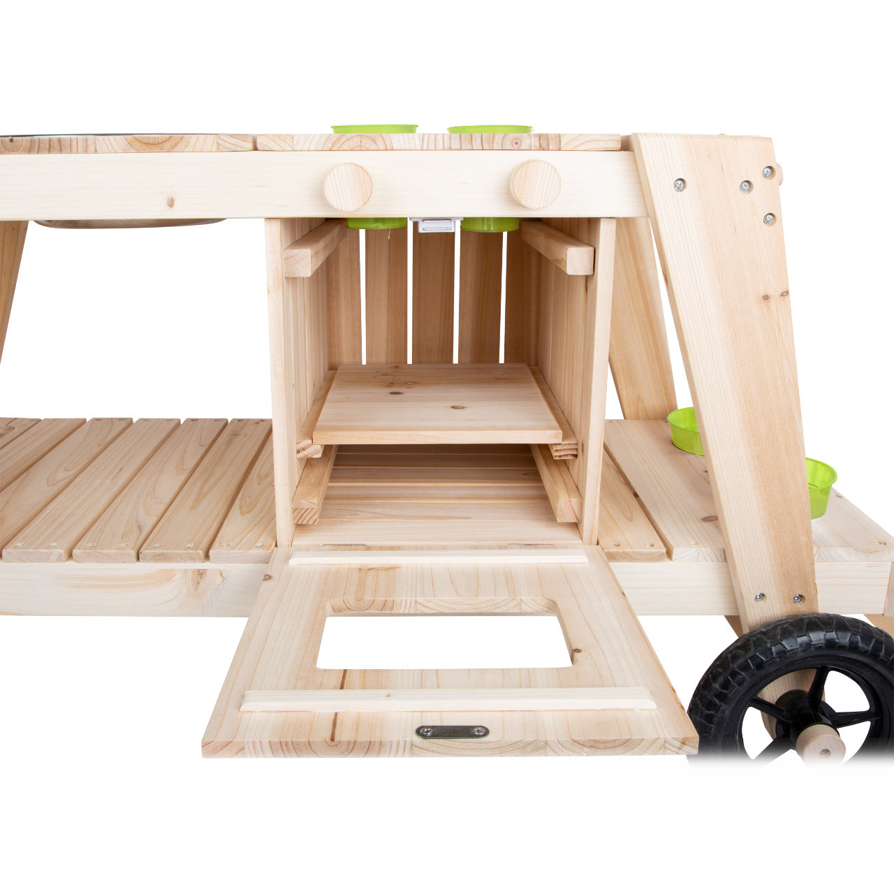 Große Stauräume bieten Platz für Küchen- oder Gartenzubehör. Zusätzlich gibt es Ablageöffnungen und Haken für weitere Utensilien. Zum Lieferumfang gehören eine Metallschüssel, zwei kleinere Schüsseln sowie zwei Blumentöpfe.