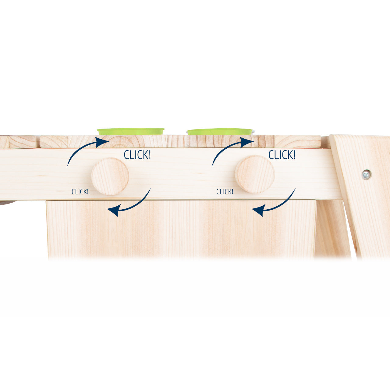 Die großzügige Arbeitsfläche ist von allen Seiten zugänglich und eignet sich für vielfältige Aktivitäten. Die Küche verfügt über einen Backofen mit Tür und drehbaren Knöpfen, die beim Drehen klickende Geräusche erzeugen. Im Inneren befindet sich eine Holzplatte, die als Backblech genutzt werden kann.