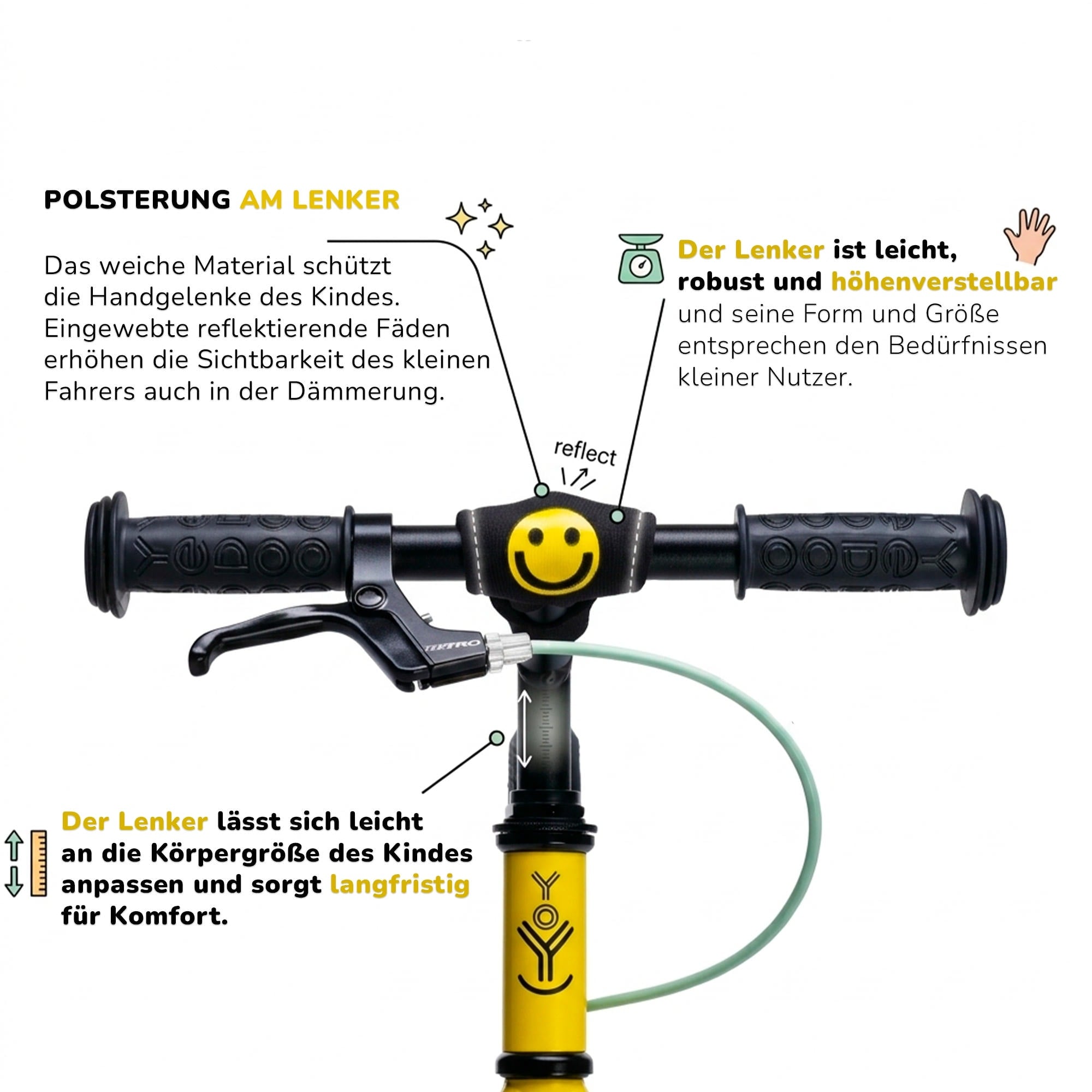 Für den Anfang sind ein Lenkungsbegrenzer gegen Überdrehen des Lenkers, ein anatomisch geformter Sattel, Lenker mit Schutzenden, Kenda-Reifen und eine Bremse mit cleverem Junior-Bremshebel (mit großartiger Übersetzung) besonders praktisch. Aber Vorsicht – die Expedition wird nicht ohne Hindernisse sein: Man muss Burgern ausweichen, tausend <3 auf den Gehweg malen und vier vierblättrige Kleeblätter im Gras finden.